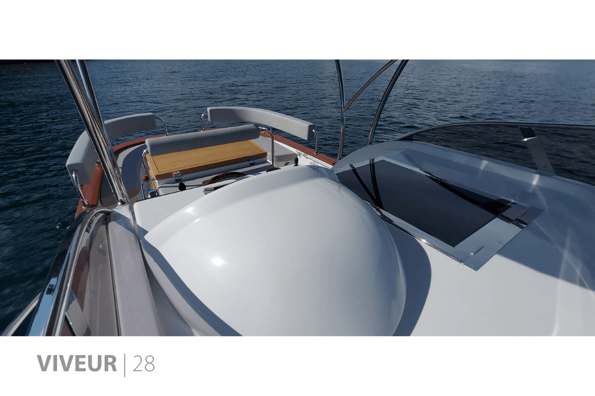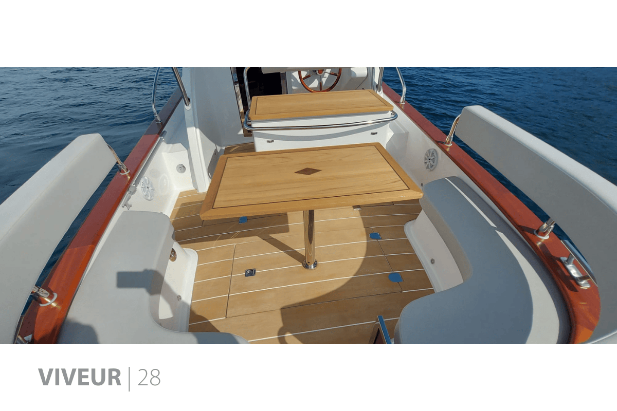 Con una velocidad máxima de 29 nudos, el VIVEUR 28 combina líneas modernas con elegancia atemporal, completado con una amplia plataforma de baño en acero inoxidable.